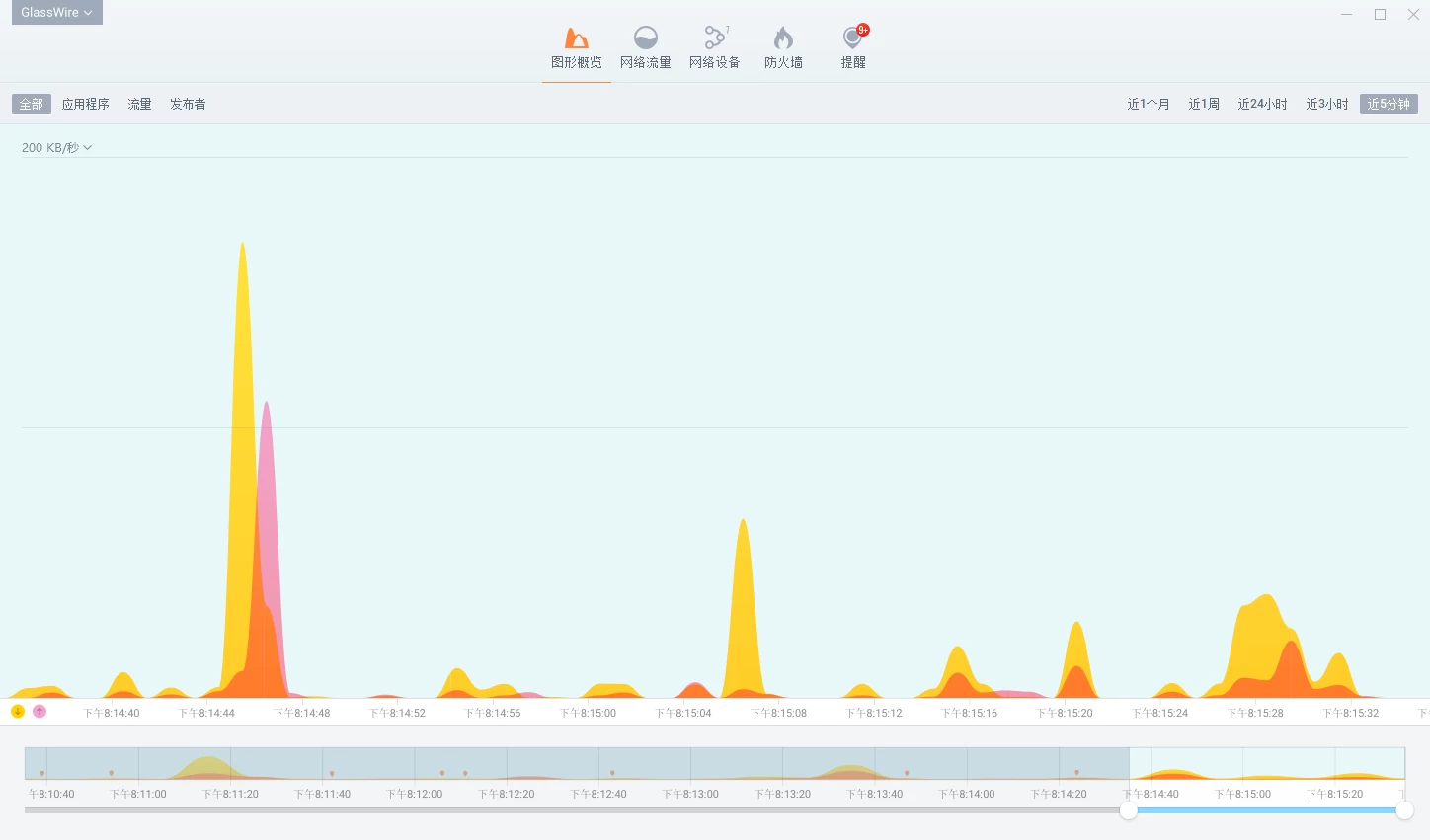 GlassWire Elite是一款非常实用的防火墙管理与网络监测工具,使用这款软件可以实时监测电脑的网络活动,软件界面简单,简单易用,可以轻松直观的通过图表形式查看到当前以及一段时间内的网络流量使用情况